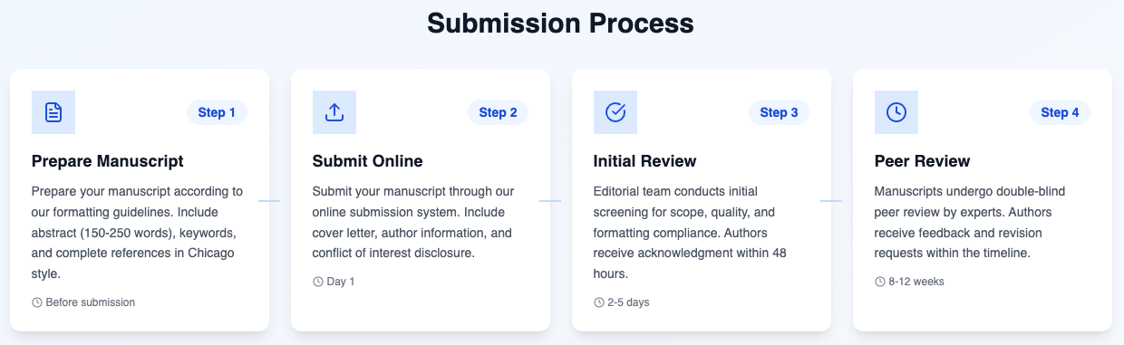 Authors must prepare their manuscripts in accordance with the journal’s manuscript requirements prior to submission. Submissions should include a complete and anonymized manuscript, an abstract of 150–250 words, 4–6 keywords, and full references formatted in accordance with the Chicago Manual of Style (17th edition). Authors are responsible for ensuring that the manuscript meets all formatting, ethical, and anonymization requirements before submission.